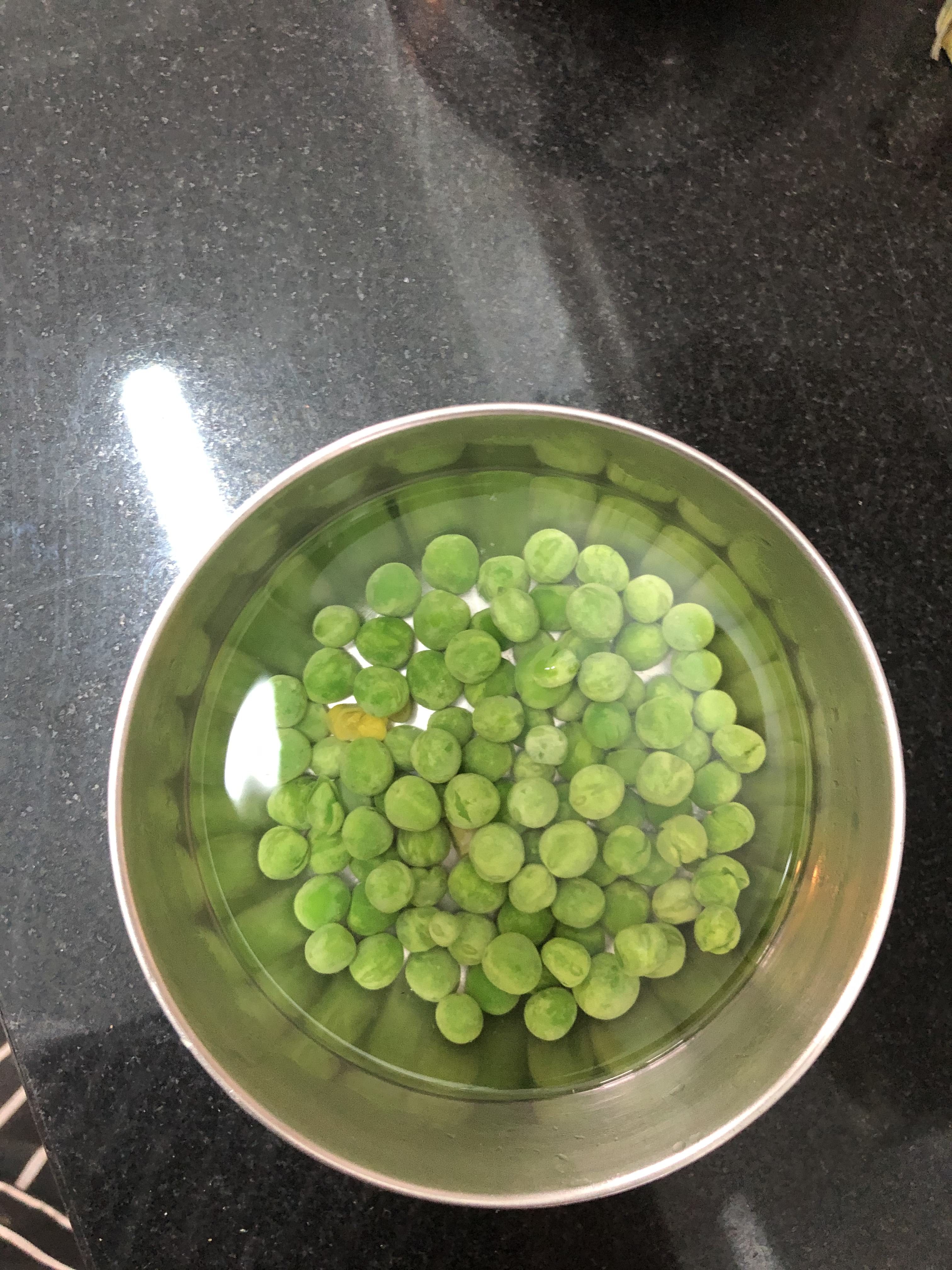 - Soak green peas if using, in warm water for 10 minutes, then drain and set aside
