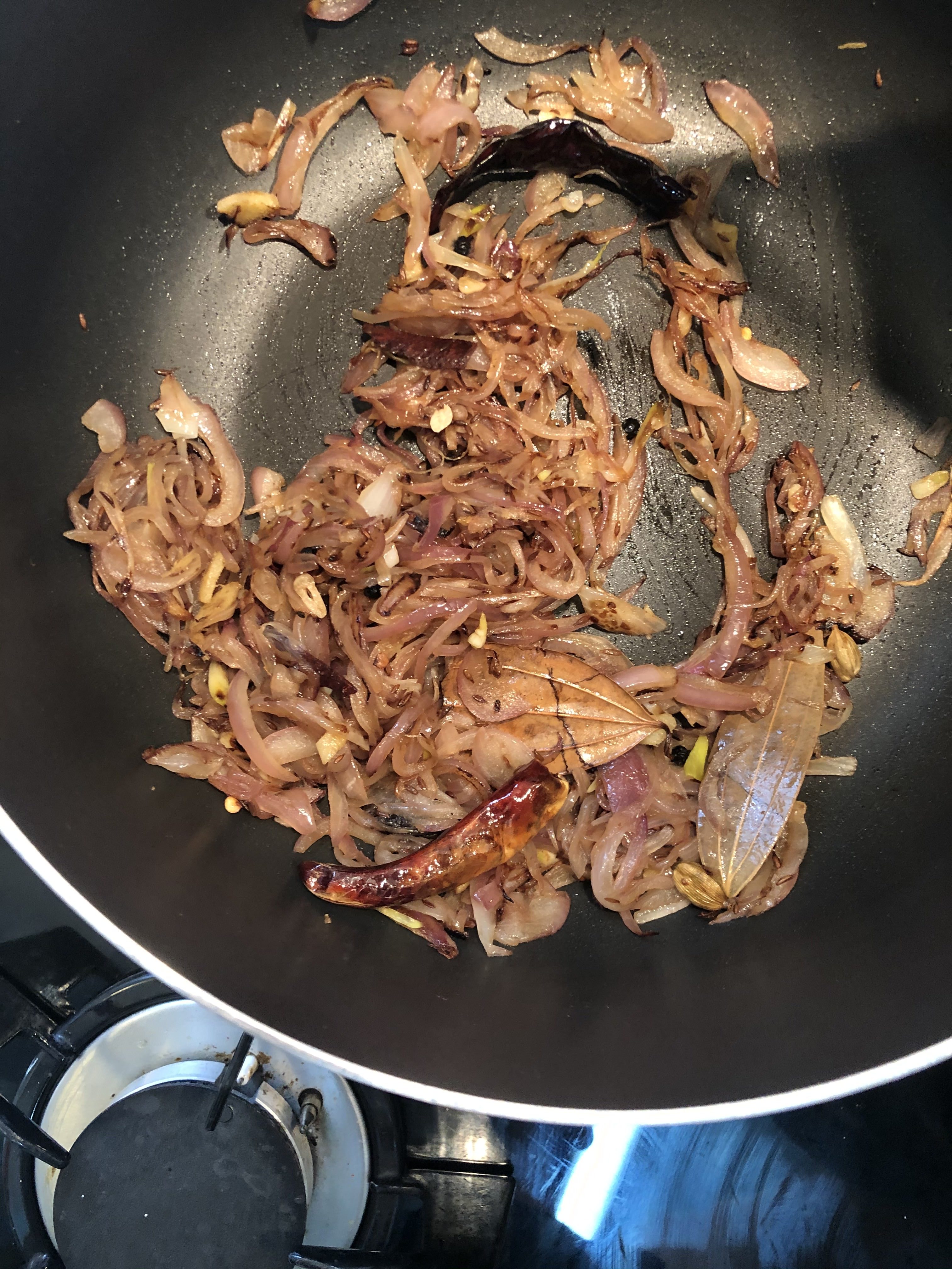 - Heat oil in a thick bottomed wok and reduce the flame to medium once oil is hot and add whole spices -bay leaf, cumin, dried red chilies, cinnamon , black pepper corn, black and green cardamoms and stir for a minute or until fragrant