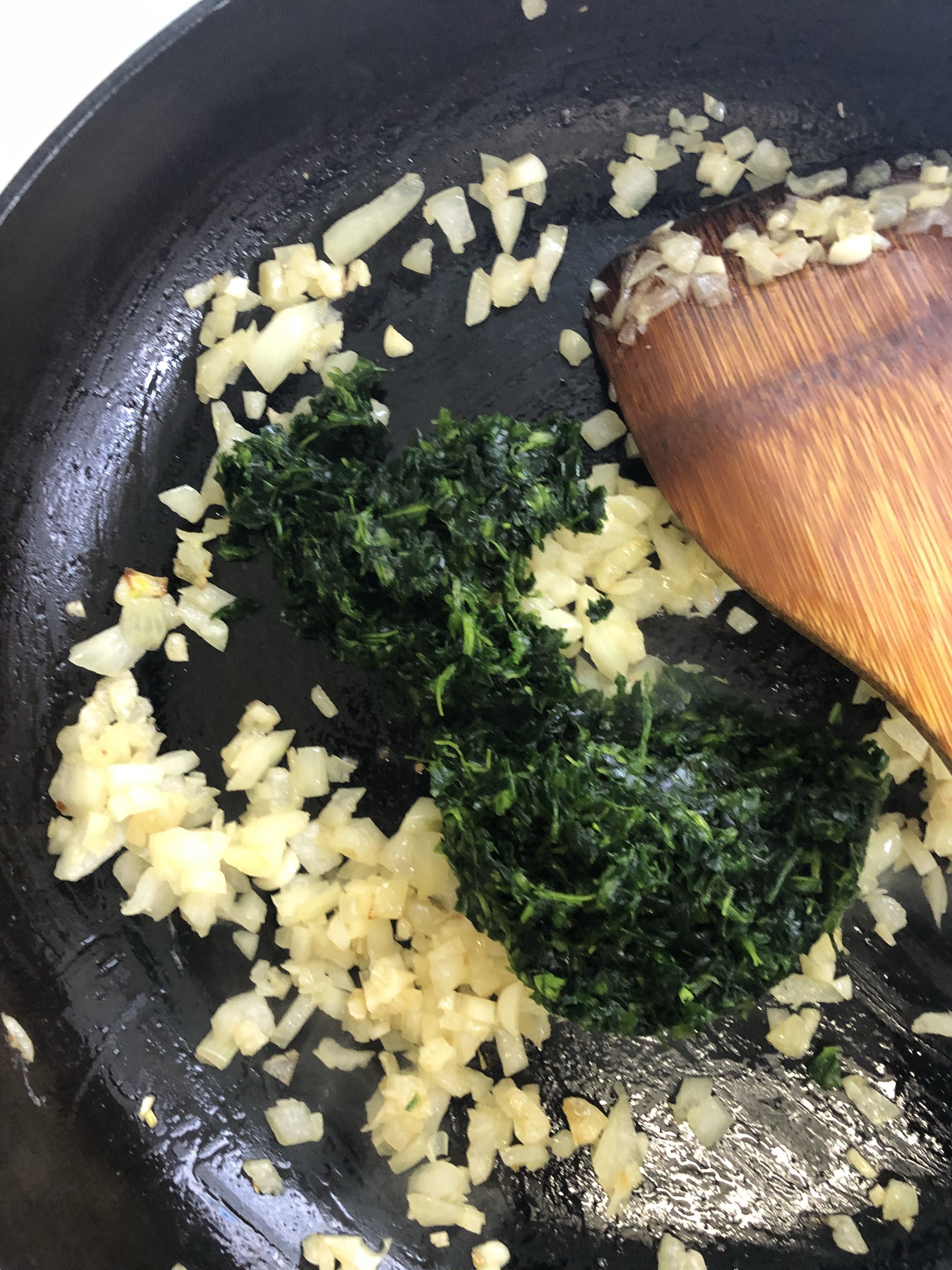 - While the cauliflower is baking prepare the curry base in a heavy bottomed skillet with a dash of oil