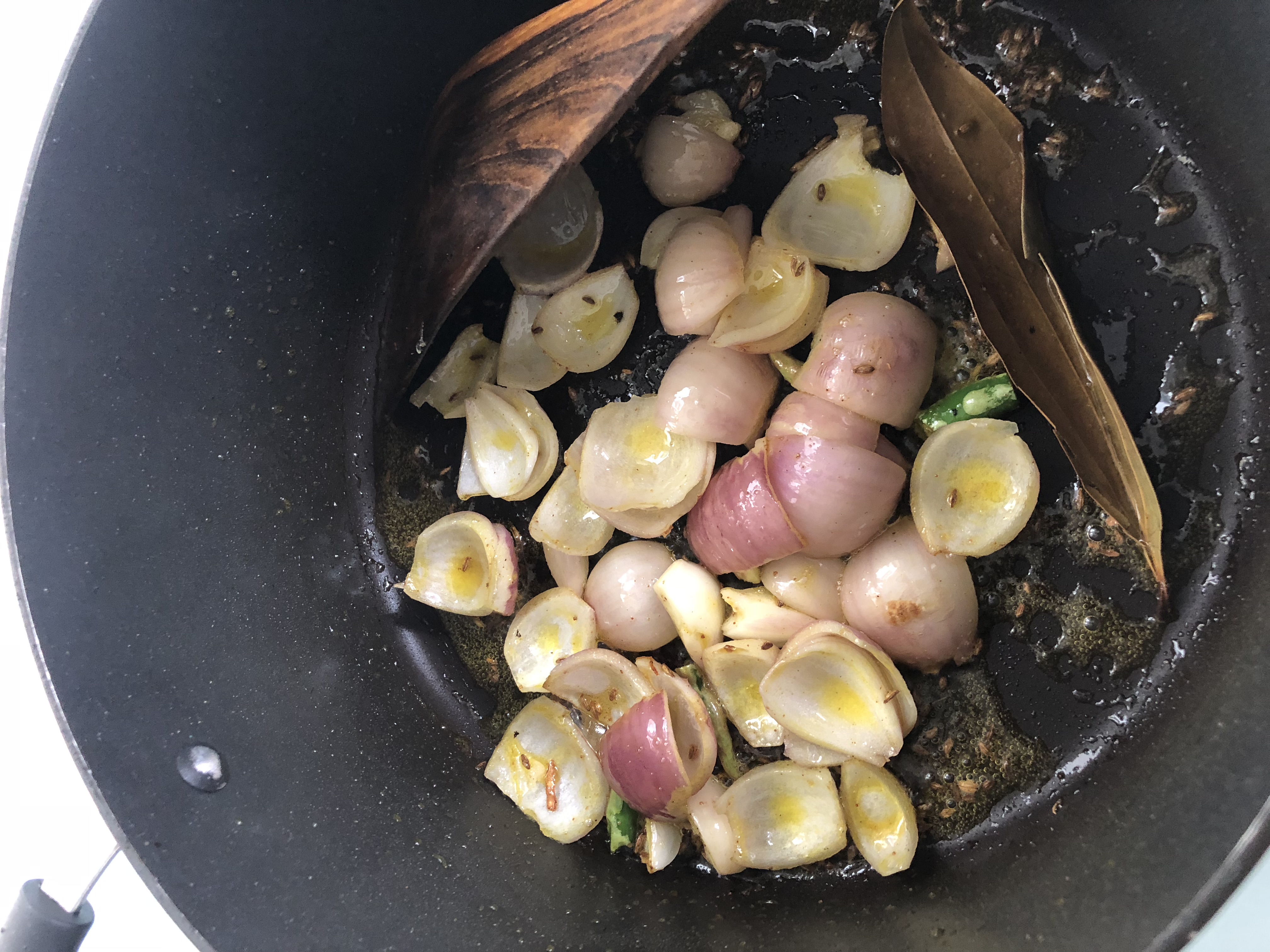 - To a thick bottomed wide pan or skillet, add oil and once hot, add the mustard and cumin seeds and curry leaves. Once the seeds start to crackle, add the stuffed eggplant and reduce the flame to low. Cover and cook until 70% done.